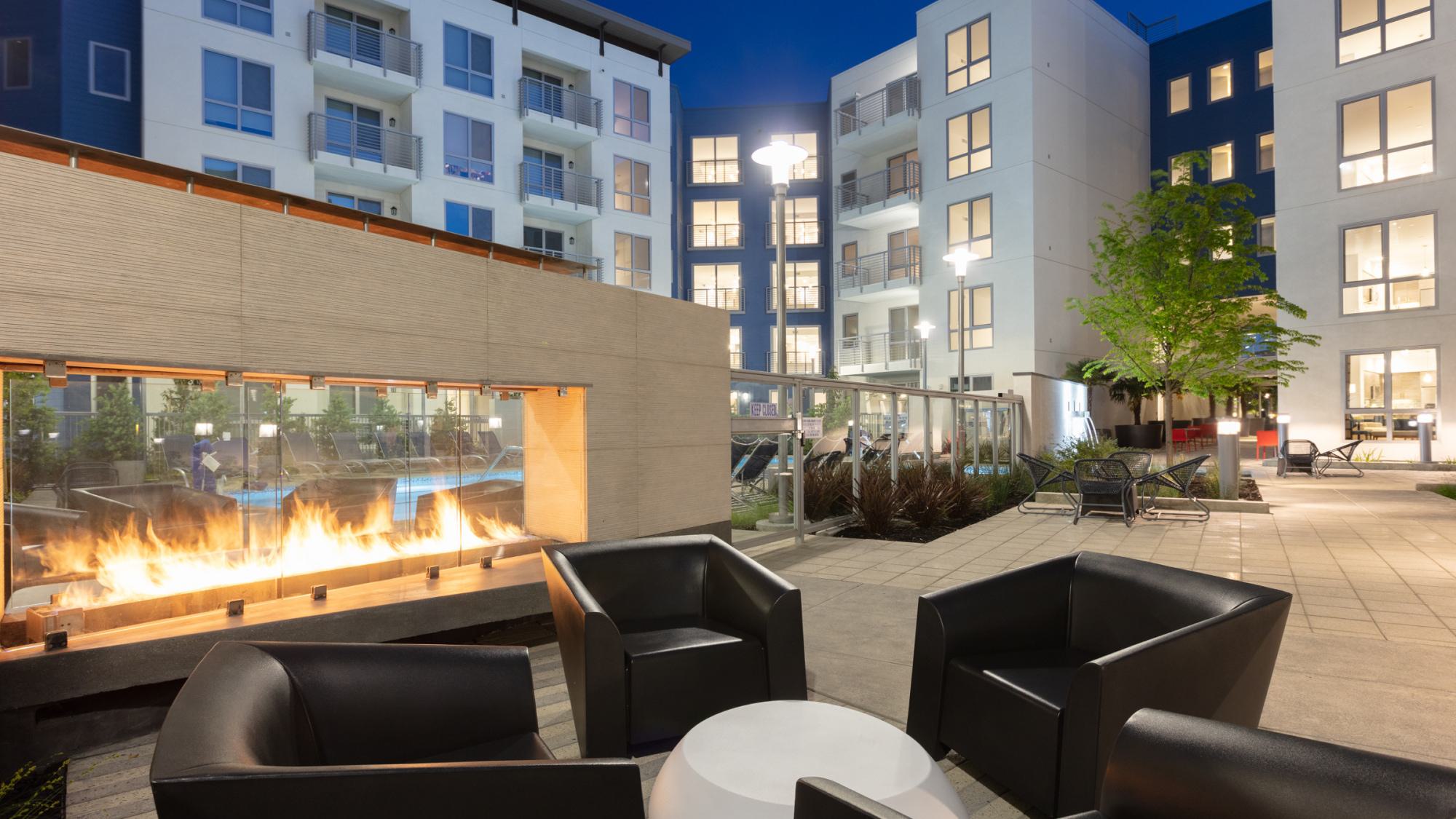 Fireside ambiance on the outdoor pool deck.