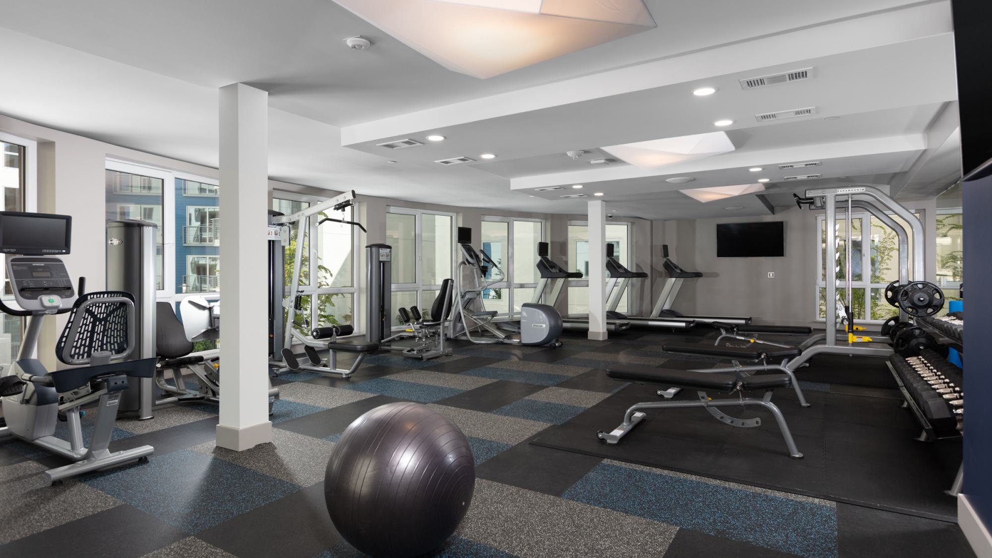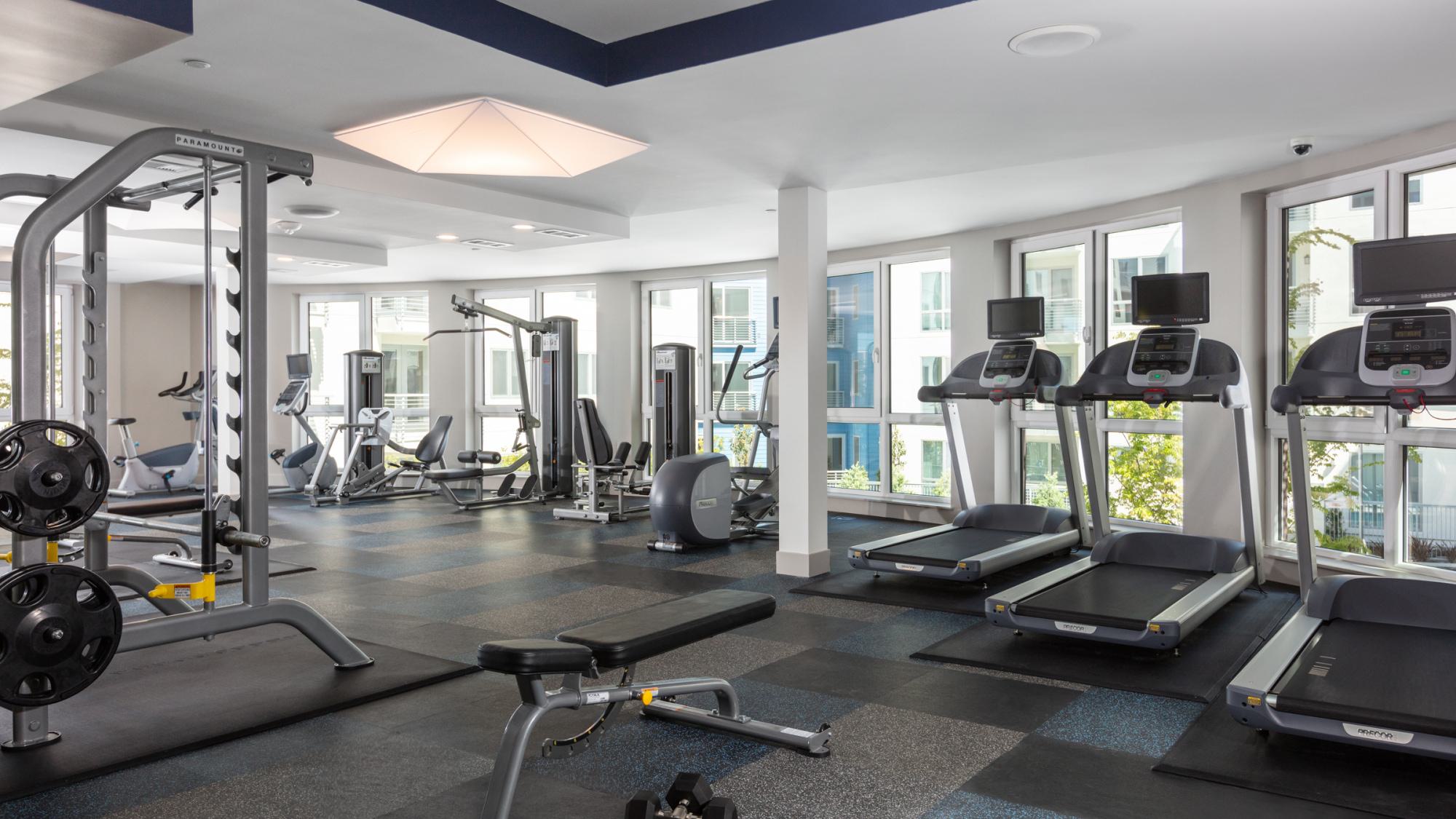 Floor-to-ceiling windows fill the gym with natural light.
